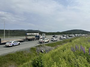 On Thursday, July 13, 2023, RNC Traffic Services and Operational Patrol Services (OPS) were joined by RCMP-NL and Highway Enforcement to conduct a traffic safety checkpoint in the area of East White Hills on the Trans-Canada Highway. The checkpoint focused on cargo securement, licensing and equipment compliance, and Highway Traffic Act (HTA) compliance. In the two-hour timeframe of the operation, officers issued 30 summary offence tickets to vehicle operators. There were vehicles seized related to HTA non-compliance, vehicles removed from the road for non-compliance with licensing and equipment regulations, as well as notices issued for mandatory vehicle inspections.