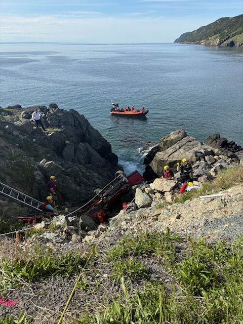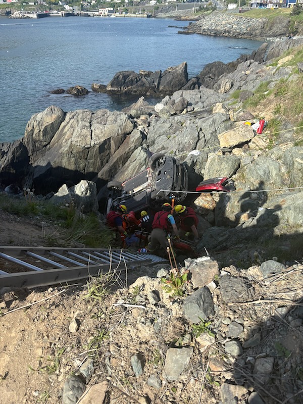 Members of the Portugal Cove-St. Philip’s Volunteer Fire Department, St. John’s Regional Fire Department’s High Angle Rescue Team, NL Health Services, the Canadian Coast Guard, Avalon Towing, and the RNC, all worked together to stabilize the vehicle and extract the two occupants. The elderly male and female were sent to hospital with what is believed to be non-life-threatening injuries.